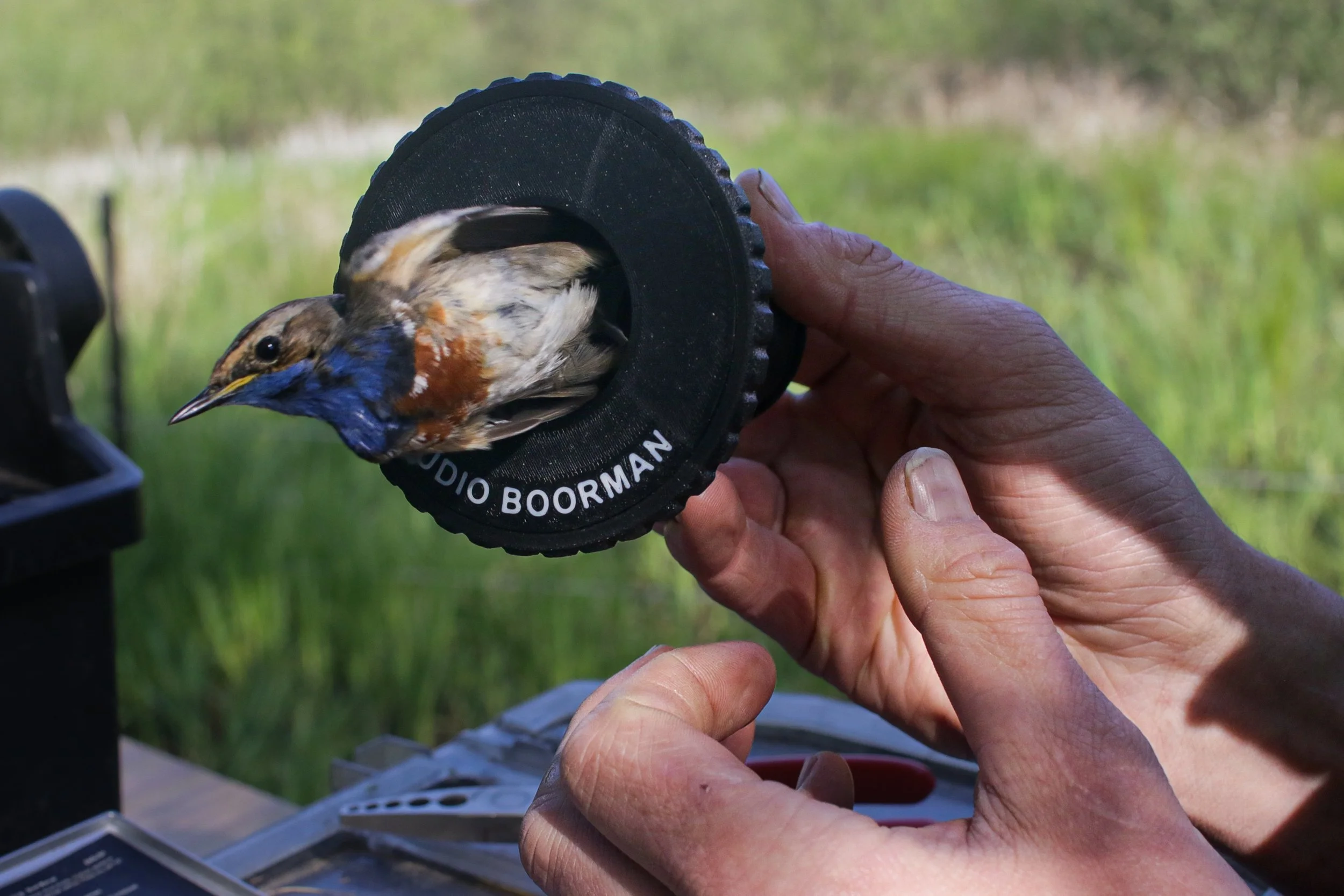 S/R features an iris mechanism that allows for quick and one-handed opening of the bottom of the container with a single twist motion. Birds can be gently pushed (rather than pulled) out of the tube. Either back into the hand for further processing or simply to be released into the wild.